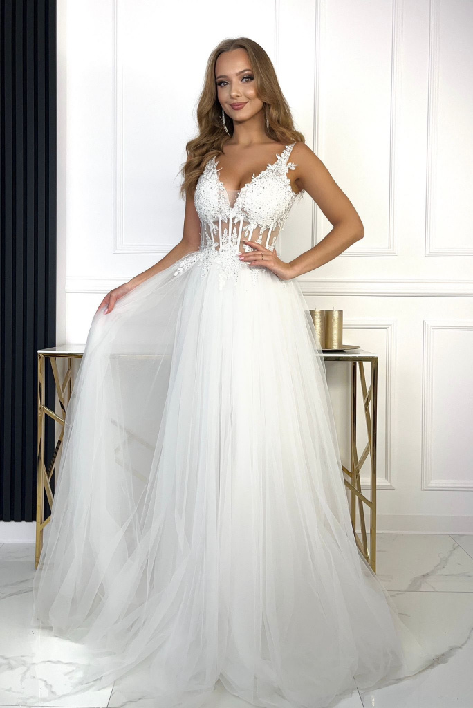 BIELE SPOLOČENSKÉ ŠATY S TYLOVOU SUKŇOU