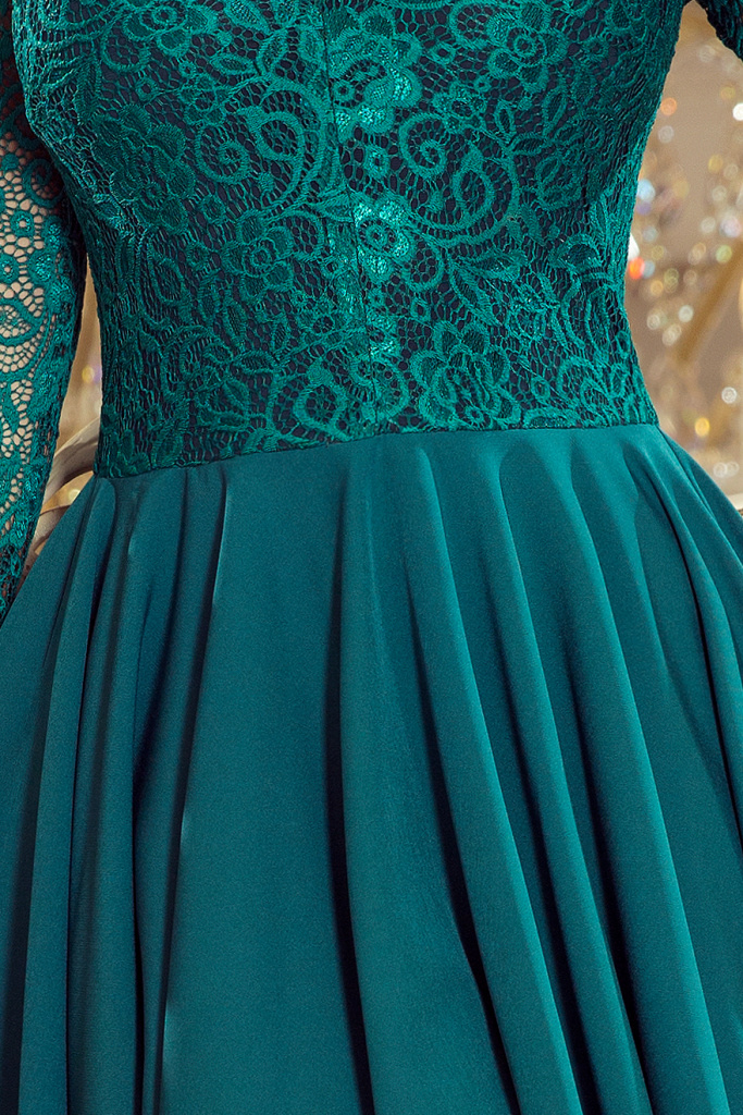 ZELENÉ ASYMETRICKÉ ŠATY S DLHÝM ČIPKOVANÝM RUKÁVOM NICOLLE