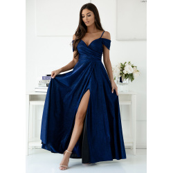 Prekladaný výstrih do V zvýrazňuje dekolt, zatiaľ čo odhalené ramená s jemnými ramienkami a spadnutými rukávmi dodávajú modelu romantický nádych. Splývavá sukňa je doplnená o vysoký rozparok, ktorý zaručuje elegantný pohyb a zmyselný vzhľad.